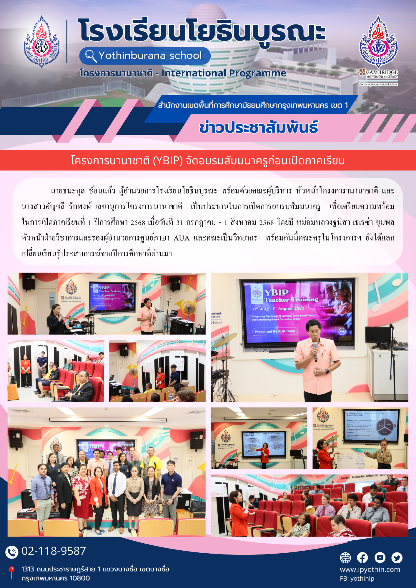 นายธนะกุล ช้อนแก้ว ผู้อำนวยการโรงเรียนโยธินบูรณะ พร้อมด้วยคณะผู้บริหาร หัวหน้าโครงการานานาชาติ และนางสาวอัญชลี รักพงษ์ เลขานุการโครงการนานาชาติ เป็นประธานในการเปิดการอบรมสัมมนาครู เพื่อเตรียมความพร้อมในการเปิดภาคเรียนที่ 1 ปีการศึกษา 2568 เมื่อวันที่ 31 กรกฎาคม - 1 สิงหาคม 2568 โดยมี หม่อมหลวงฐนิสา เธเรซ่า ชุมพล หัวหน้าฝ่ายวิชาการและรองผู้อำนวยการศูนย์ภาษา AUA และคณะเป็นวิทยากร พร้อมกันนี้คณะครูในโครงการฯ ยังได้แลกเปลี่ยนเรียนรู้ประสบการณ์จากปีการศึกษาที่ผ่านมา