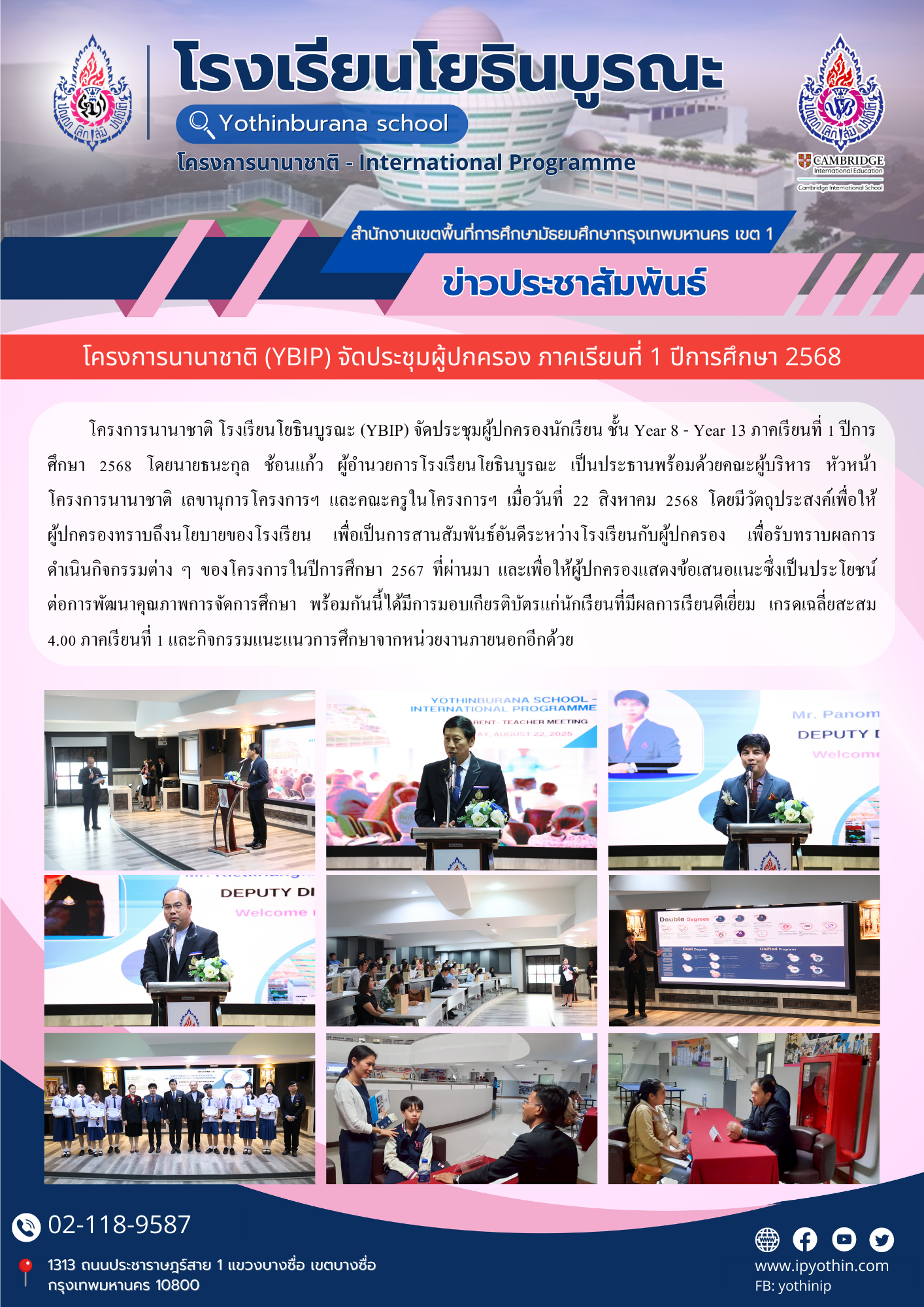 โครงการนานาชาติ โรงเรียนโยธินบูรณะ (YBIP) จัดประชุมผู้ปกครองนักเรียน ชั้น Year 8 - Year 13 ภาคเรียนที่ 1 ปีการศึกษา 2568 โดยนายธนะกุล ช้อนแก้ว ผู้อำนวยการโรงเรียนโยธินบูรณะ เป็นประธานพร้อมด้วยคณะผู้บริหาร หัวหน้าโครงการนานาชาติ เลขานุการโครงการฯ และคณะครูในโครงการฯ เมื่อวันที่ 22 สิงหาคม 2568 โดยมีวัตถุประสงค์เพื่อให้ ผู้ปกครองทราบถึงนโยบายของโรงเรียน เพื่อเป็นการสานสัมพันธ์อันดีระหว่างโรงเรียนกับผู้ปกครอง เพื่อรับทราบผลการดำเนินกิจกรรมต่าง ๆ ของโครงการในปีการศึกษา 2567 ที่ผ่านมา และเพื่อให้ผู้ปกครองแสดงข้อเสนอแนะซึ่งเป็นประโยชน์ ต่อการพัฒนาคุณภาพการจัดการศึกษา พร้อมกันนี้ได้มีการมอบเกียรติบัตรแก่นักเรียนที่มีผลการเรียนดีเยี่ยม เกรดเฉลี่ยสะสม 4.00 ภาคเรียนที่ 1 และกิจกรรมแนะแนวการศึกษาจากหน่วยงานภายนอกอีกด้วย