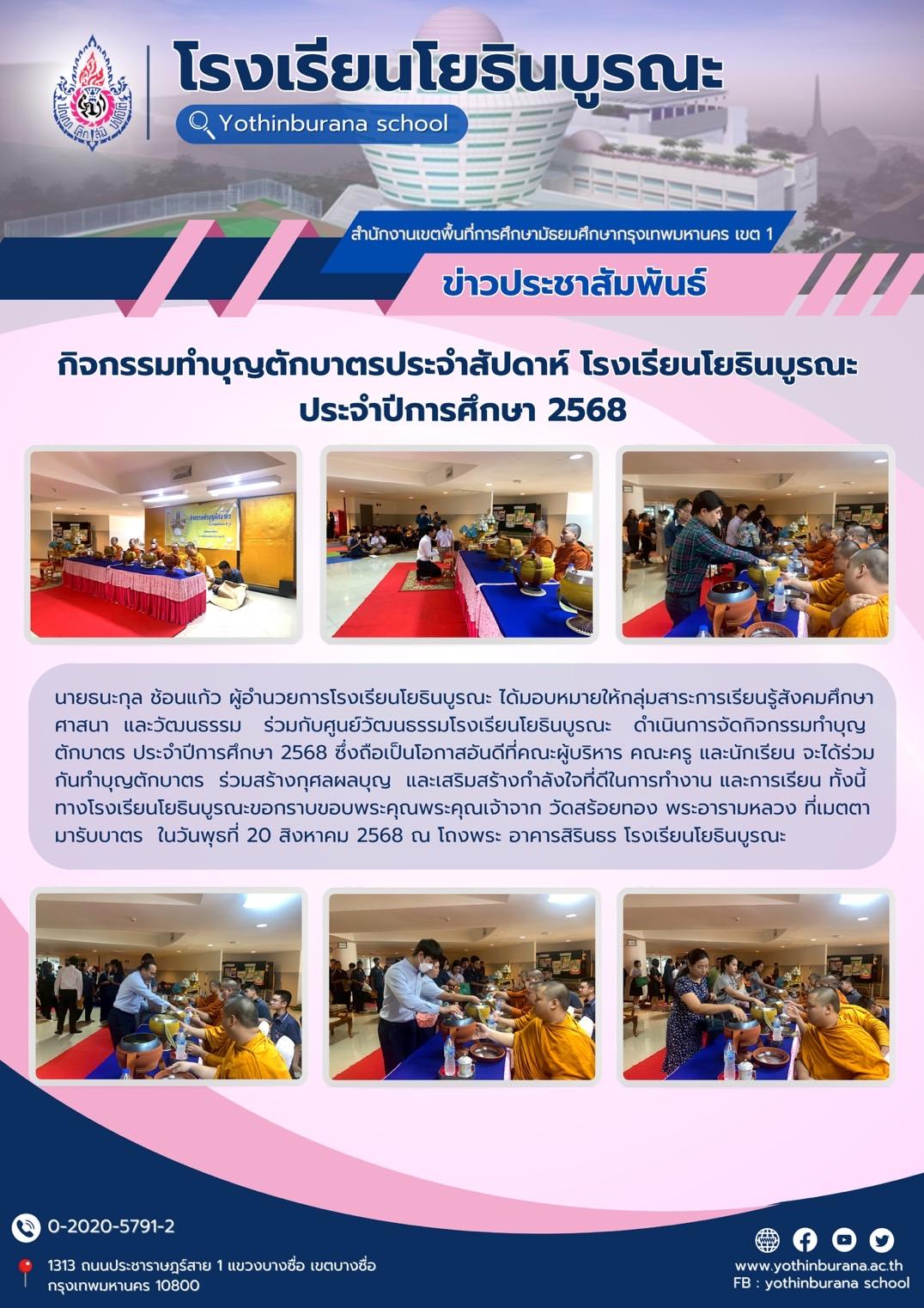 นายธนะกุล ช้อนแก้ว ผู้อำนวยการโรงเรียนโยธินบูรณะ ได้มอบหมายให้กลุ่มสาระการเรียนรู้สังคมศึกษา ศาสนา และวัฒนธรรม ร่วมกับศูนย์วัฒนธรรมโรงเรียนโยธินบูรณะ ดำเนินการจัดกิจกรรมทำบุญตักบาตร ประจำปีการศึกษา 2568 ซึ่งถือเป็นโอกาสอันดีที่คณะผู้บริหาร คณะครู และนักเรียน จะได้ร่วมกันทำบุญตักบาตร ร่วมสร้างกุศลผลบุญ และเสริมสร้างกำลังใจที่ดีในการทำงาน และการเรียน ทั้งนี้ทางโรงเรียนโยธินบูรณะขอกราบขอบพระคุณพระคุณเจ้าจาก วัดสร้อยทอง พระอารามหลวง ที่เมตตามารับบาตร ในวันพุธที่ 20 สิงหาคม 2568 ณ โถงพระ อาคารสิรินธร โรงเรียนโยธินบูรณะ