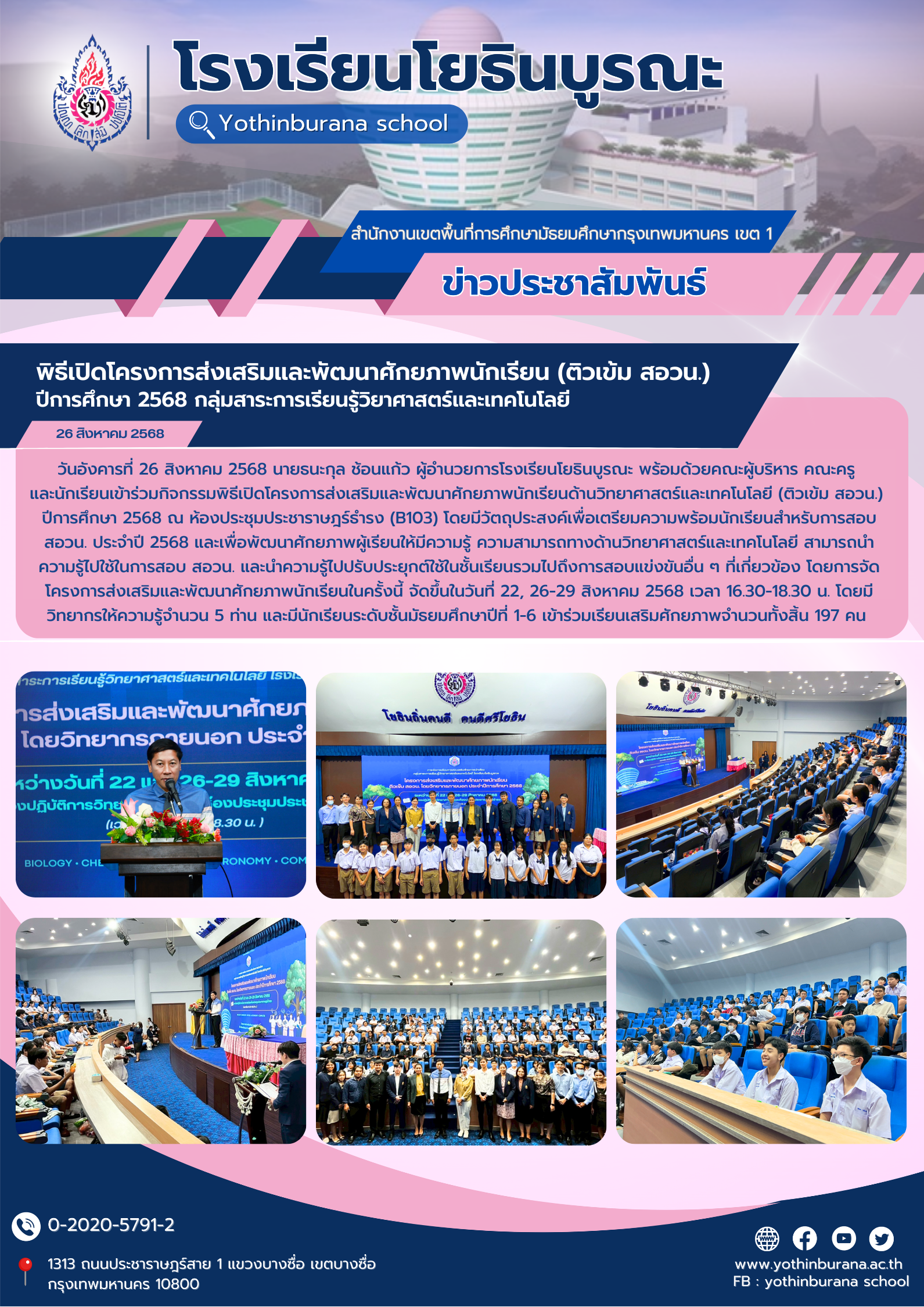 วันอังคารที่ 26 สิงหาคม 2568 นายธนะกุล ช้อนแก้ว ผู้อำนวยการโรงเรียนโยธินบูรณะ พร้อมด้วยคณะผู้บริหาร คณะครู และนักเรียนเข้าร่วมกิจกรรมพิธีเปิดโครงการส่งเสริมและพัฒนาศักยภาพนักเรียนด้านวิทยาศาสตร์และเทคโนโลยี (ติวเข้ม สอวน.) ปีการศึกษา 2568 ณ ห้องประชุมประชาราษฎร์ธำรง (B103) โดยมีวัตถุประสงค์เพื่อเตรียมความพร้อมนักเรียนสำหรับการสอบ สอวน. ประจำปี 2568 และเพื่อพัฒนาศักยภาพผู้เรียนให้มีความรู้ ความสามารถทางด้านวิทยาศาสตร์และเทคโนโลยี สามารถนำความรู้ไปใช้ในการสอบ สอวน. และนำความรู้ไปปรับประยุกต์ใช้ในชั้นเรียนรวมไปถึงการสอบแข่งขันอื่น ๆ ที่เกี่ยวข้อง โดยการจัดโครงการส่งเสริมและพัฒนาศักยภาพนักเรียนในครั้งนี้ จัดขึ้นในวันที่ 22, 26-29 สิงหาคม 2568 เวลา 16.30-18.30 น. โดยมีวิทยากรให้ความรู้จำนวน 5 ท่าน และมีนักเรียนระดับชั้นมัธยมศึกษาปีที่ 1-6 เข้าร่วมเรียนเสริมศักยภาพจำนวนทั้งสิ้น 197 คน