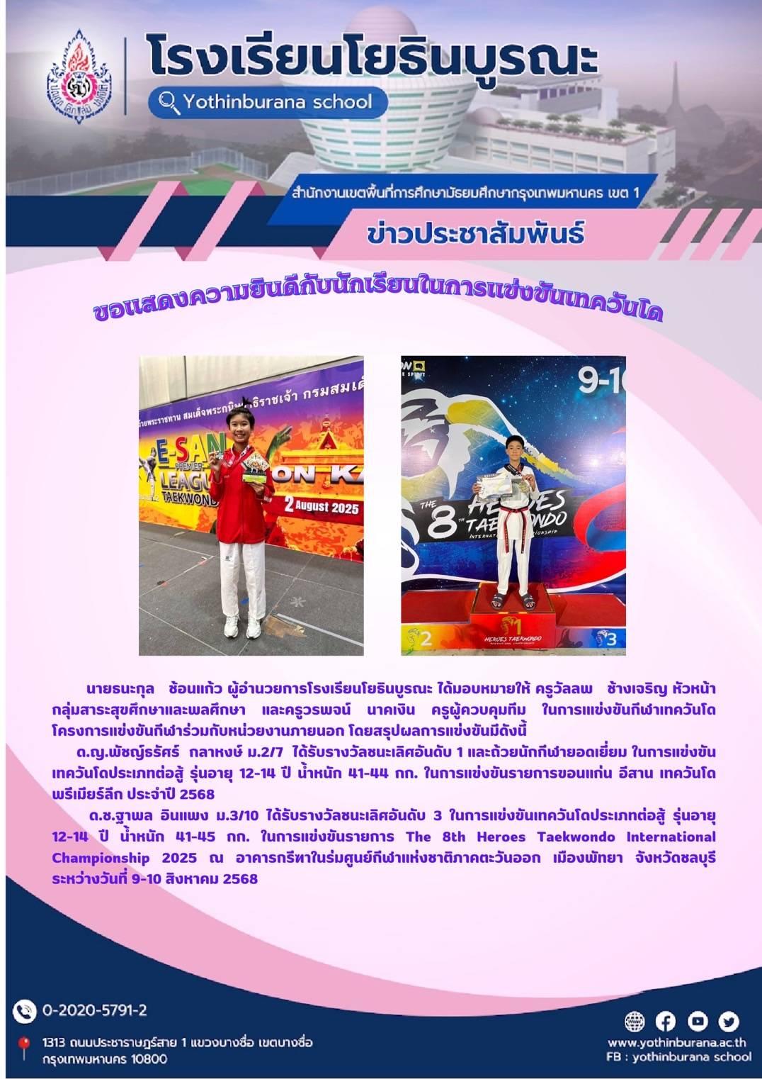 นายธนะกุล ช้อนแก้ว ผู้อำนวยการโรงเรียนโยธินบูรณะ ได้มอบหมายให้ ครูวัลลพ ช้างเจริญ หัวหน้ากลุ่มสาระสุขศึกษาและพลศึกษา และครูวรพจน์ นาคเงิน ครูผู้ควบคุมทีม ในการเแข่งขันกีฬาเทควันโด โครงการแข่งขันกีฬาร่วมกับหน่วยงานภายนอก โดยสรุปผลการแข่งขันมีดังนี้ ด.ญ.พัชญ์ธรัศร์ กลาหงษ์ ม.2/7 ได้รับรางวัลชนะเลิศอันดับ 1 และถ้วยนักกีฬายอดเยี่ยม ในการแข่งขันเทควันโดประเภทต่อสู้ รุ่นอายุ 12-14 ปี น้ำหนัก 41-44 กก. ในการแข่งขันรายการขอนแก่น อีสาน เทควันโด พรีเมียร์ลีก ประจำปี 2568 ด.ช.ฐาพล อินแพง ม.3/10 ได้รับรางวัลชนะเลิศอันดับ 3 ในการแข่งขันเทควันโดประเภทต่อสู้ รุ่นอายุ 12-14 ปี น้ำหนัก 41-45 กก. ในการแข่งขันรายการ The 8th Heroes Taekwondo International Championship 2025 ณ อาคารกรีฑาในร่มศูนย์กีฬาแห่งชาติภาคตะวันออก เมืองพัทยา จังหวัดชลบุรี ระหว่างวันที่ 9-10 สิงหาคม 2568