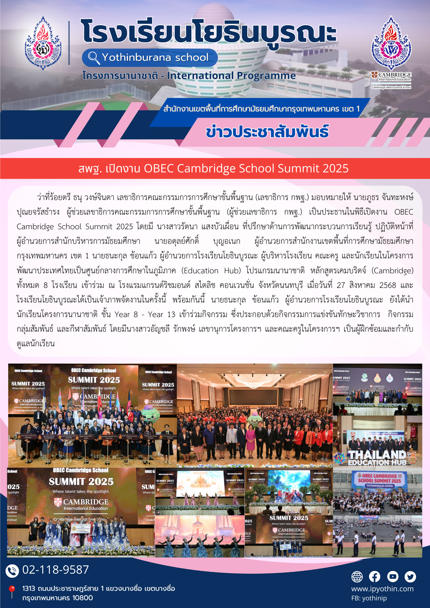 ว่าที่ร้อยตรี ธนุ วงษ์จินดา เลขาธิการคณะกรรมการการศึกษาขั้นพื้นฐาน (เลขาธิการ กพฐ.) มอบหมายให้ นายภูธร จันทะหงษ์ ปุณยจรัสธำรง ผู้ช่วยเลขาธิการคณะกรรมการการศึกษาขั้นพื้นฐาน (ผู้ช่วยเลขาธิการ กพฐ.) เป็นประธานในพิธีเปิดงาน OBEC Cambridge School Summit 2025 โดยมี นางสาวรัตนา แสงบัวเผื่อน ที่ปรึกษาด้านการพัฒนากระบวนการเรียนรู้ ปฏิบัติหน้าที่ ผู้อำนวยการสำนักบริหารการมัธยมศึกษา นายอดุลย์ศักดิ์ บุญอเนก ผู้อำนวยการสำนักงานเขตพื้นที่การศึกษามัธยมศึกษากรุงเทพมหานคร เขต 1 นายธนะกุล ช้อนแก้ว ผู้อำนวยการโรงเรียนโยธินบูรณะ ผู้บริหารโรงเรียน คณะครู และนักเรียนในโครงการพัฒนาประเทศไทยเป็นศูนย์กลางการศึกษาในภูมิภาค (Education Hub) โปรแกรมนานาชาติ หลักสูตรเคมบริดจ์ (Cambridge) ทั้งหมด 8 โรงเรียน เข้าร่วม ณ โรงแรมแกรนด์ริชมอนด์ สไตลิช คอนเวนชั่น จังหวัดนนทบุรี เมื่อวันที่ 27 สิงหาคม 2568 และโรงเรียนโยธินบูรณะได้เป็นเจ้าภาพจัดงานในครั้งนี้ พร้อมกันนี้ นายธนะกุล ข้อนแก้ว ผู้อำนวยการโรงเรียนโยธินบูรณะ ยังได้นำนักเรียนโครงการนานาชาติ ชั้น Year 8 - Year 13 เข้าร่วมกิจกรรม ซึ่งประกอบด้วยกิจกรรมการแข่งขันทักษะวิชาการ กิจกรรมกลุ่มสัมพันธ์ และกีฬาสัมพันธ์ โดยมีนางสาวอัญชลี รักพงษ์ เลขานุการโครงการฯ และคณะครูในโครงการฯ เป็นผู้ฝึกซ้อมและกำกับดูแลนักเรียน