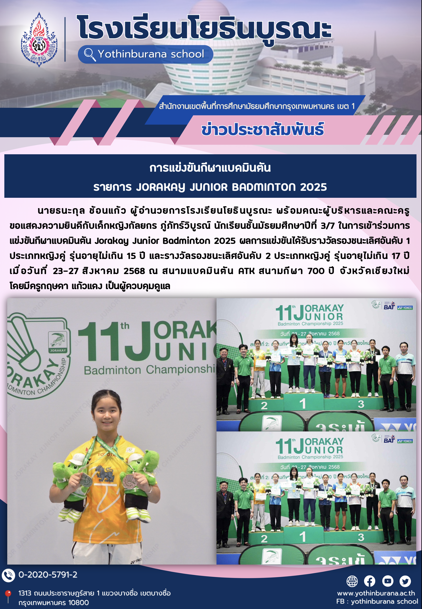 นายธนะกุล ช้อนแก้ว ผู้อำนวยการโรงเรียนโยธินบูรณะ พร้อมคณะผู้บริหารและคณะครู ขอแสดงความยินดีกับเด็กหญิงกัลยกร ภู่ภัทร์วิบูรณ์ นักเรียนชั้นมัธยมศึกษาปีที่ 3/7 ในการเข้าร่วมการแข่งขันกีฬาแบดมินตัน Jorakay Junior Badminton 2025 ผลการแข่งขันได้รับรางวัลรองชนะเลิศอันดับ 1 ประเภทหญิงคู่ รุ่นอายุไม่เกิน 15 ปี และรางวัลรองชนะเลิศอันดับ 2 ประเภทหญิงคู่ รุ่นอายุไม่เกิน 17 ปี เมื่อวันที่ 23-27 สิงหาคม 2568 ณ สนามแบดมินตัน ATK สนามกีฬา 700 ปี จังหวัดเชียงใหม่ โดยมีครูกฤษดา แก้วแดง เป็นผู้ควบคุมดูแล