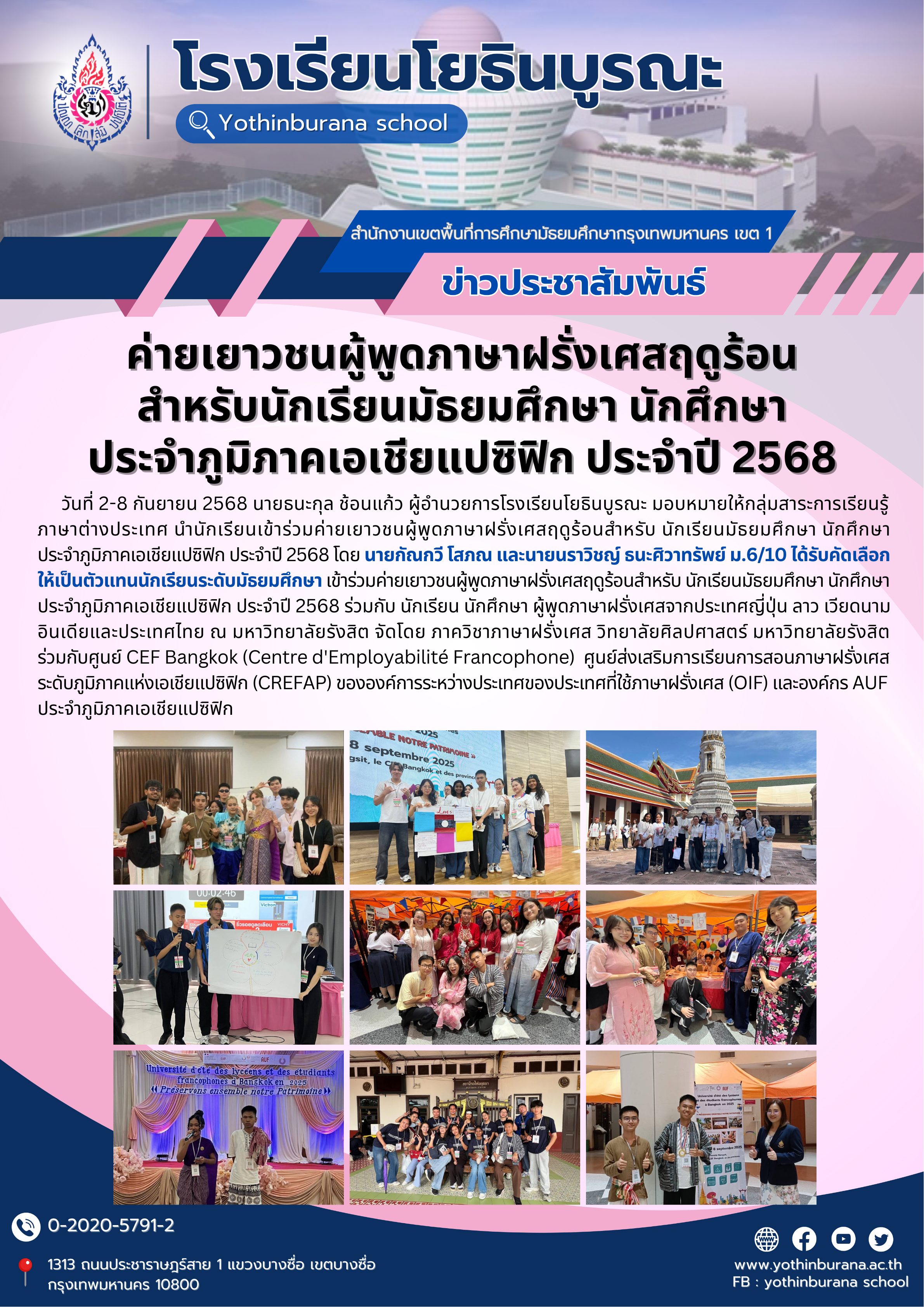 วันที่ 2-8 กันยายน 2568 นายธนะกุล ช้อนแก้ว ผู้อำนวยการโรงเรียนโยธินบูรณะ มอบหมายให้กลุ่มสาระการเรียนรู้ภาษาต่างประเทศ นำนักเรียนเข้าร่วมค่ายเยาวชนผู้พูดภาษาฝรั่งเศสฤดูร้อนสำหรับ นักเรียนมัธยมศึกษา นักศึกษาประจำภูมิภาคเอเชียแปซิฟิก ประจำปี 2568 โดย นายกัณกวี โสภณ และนายนราวิชญ์ ธนะศิวาทรัพย์ ม.6/10 ได้รับคัดเลือกให้เป็นตัวแทนนักเรียนระดับมัธยมศึกษา เข้าร่วมค่ายเยาวชนผู้พูดภาษาฝรั่งเศสฤดูร้อนสำหรับ นักเรียนมัธยมศึกษา นักศึกษาประจำภูมิภาคเอเชียแปซิฟิก ประจำปี 2568 ร่วมกับ นักเรียน นักศึกษา ผู้พูดภาษาฝรั่งเศสจากประเทศญี่ปุ่น ลาว เวียดนาม อินเดียและประเทศไทย ณ มหาวิทยาลัยรังสิต จัดโดย ภาควิชาภาษาฝรั่งเศส วิทยาลัยศิลปศาสตร์ มหาวิทยาลัยรังสิต ร่วมกับศูนย์ CEF Bangkok (Centre d Employabilite Francophone) ศูนย์ส่งเสริมการเรียนการสอนภาษาฝรั่งเศสระดับภูมิภาคแห่งเอเชียแปซิฟิก (CREFAP) ขององค์การระหว่างประเทศของประเทศที่ใช้ภาษาฝรั่งเศส (OIF) และองค์กร AUF ประจำภูมิภาคเอเชียแปซิฟิก