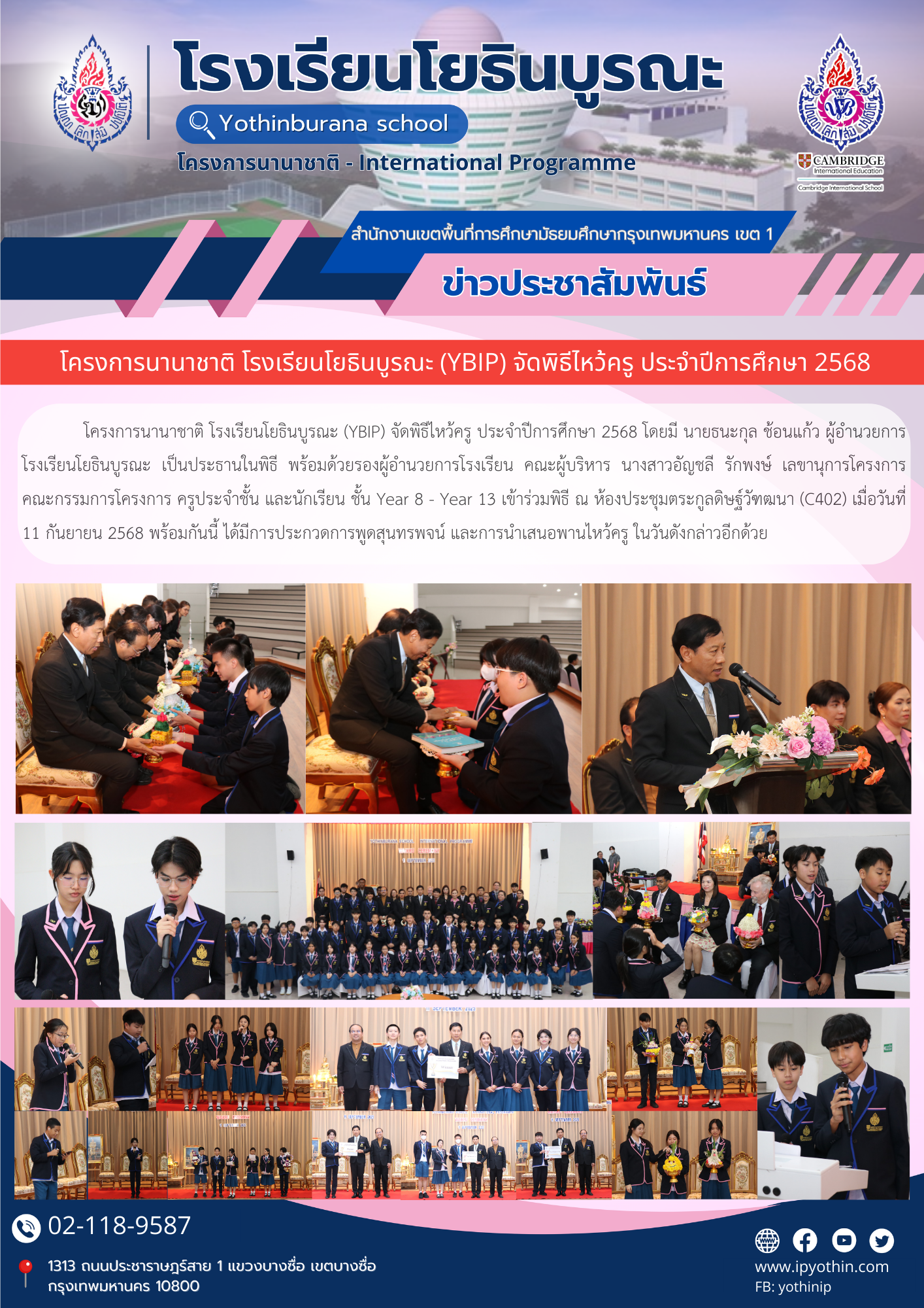 โครงการนานาชาติ โรงเรียนโยธินบูรณะ (YBIP) จัดพิธีไหว้ครู ประจำปีการศึกษา 2568 โดยมี นายธนะกุล ช้อนแก้ว ผู้อำนวยการโรงเรียนโยธินบูรณะ เป็นประธานในพิธี พร้อมด้วยรองผู้อำนวยการโรงเรียน คณะผู้บริหาร นางสาวอัญชลี รักพงษ์ เลขานุการโครงการ คณะกรรมการโครงการ ครูประจำชั้น และนักเรียน ชั้น Year 8 - Year 13 เข้าร่วมพิธี ณ ห้องประชุมตระกูลดิษฐ์วัฑฒนา (C402) เมื่อวันที่ 11 กันยายน 2568 พร้อมกันนี้ ได้มีการประกวดการพูดสุนทรพจน์ และการนำเสนอพานไหว้ครู ในวันดังกล่าวอีกด้วย