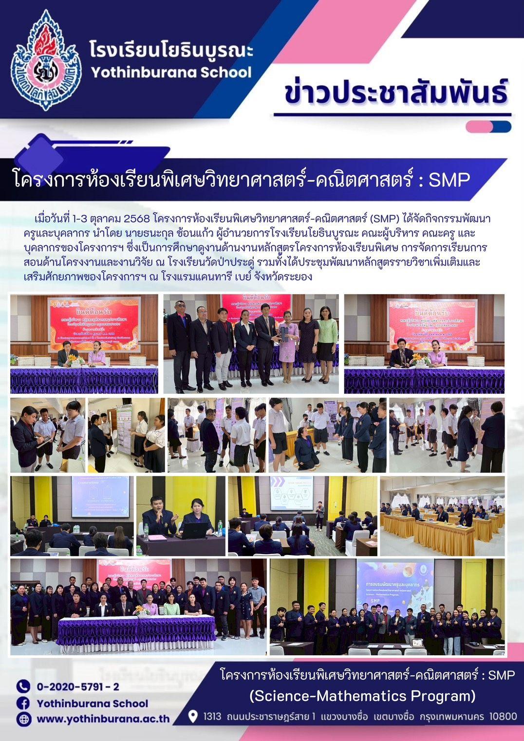เมื่อวันที่ 1-3 ตุลาคม 2568 โครงการห้องเรียนพิเศษวิทยาศาสตร์-คณิตศาสตร์ (SMP) ได้จัดกิจกรรมพัฒนาครูและบุคลากร นำโดย นายธนะกุล ช้อนแก้ว ผู้อำนวยการโรงเรียนโยธินบูรณะ คณะผู้บริหาร คณะครู และบุคลากรของโครงการฯ ซึ่งเป็นการศึกษาดูงานด้านงานหลักสูตรโครงการห้องเรียนพิเศษ การจัดการเรียนการสอนด้านโครงงานและงานวิจัย ณ โรงเรียนวัดป่าประดู่ รวมทั้งได้ประชุมพัฒนาหลักสูตรรายวิชาเพิ่มเติมและเสริมศักยภาพของโครงการฯ ณ โรงแรมแคนทารี เบย์ จังหวัดระยอง