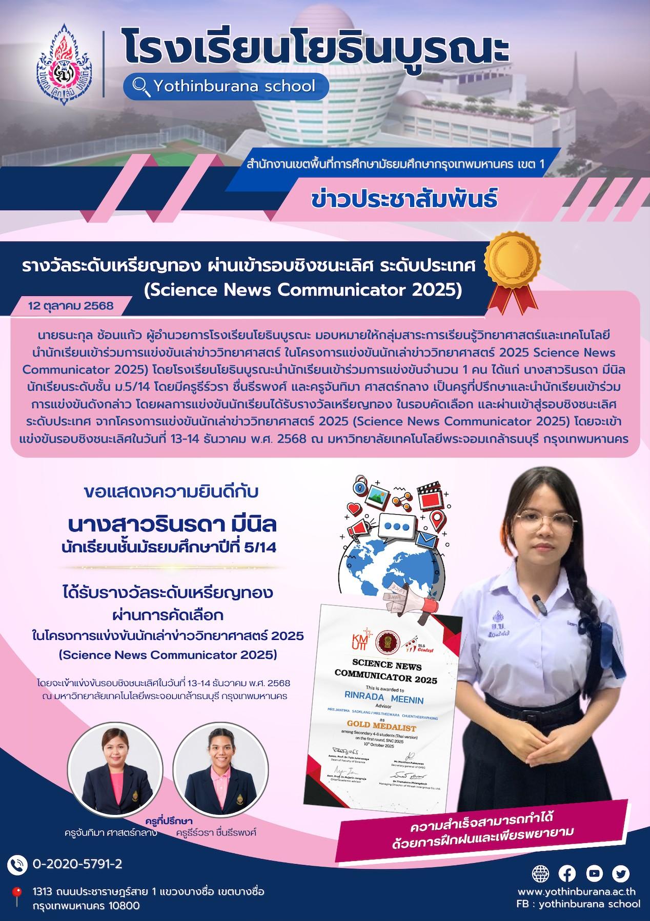 👉นายธนะกุล ช้อนแก้ว ผู้อำนวยการโรงเรียนโยธินบูรณะ มอบหมายให้กลุ่มสาระการเรียนรู้วิทยาศาสตร์และเทคโนโลยี นำนักเรียนเข้าร่วมการแข่งขันเล่าข่าววิทยาศาสตร์ในโครงการแข่งขันนักเล่าข่าววิทยาศาสตร์ 2025 Science News Communicator 2025)โดยโรงเรียนโยธินบูรณะนำนักเรียนเข้าร่วมการแข่งขันจำนวน 1 คน ได้แก่ นางสาวรินรดา มีนิล นักเรียนระดับชั้น ม.5/14 โดยมีครูธีร์วรา ชื่นธีรพงศ์ และครูจันทิมา ศาสตร์กลาง เป็นครูที่ปรึกษาและนำนักเรียนเข้าร่วมการแข่งขันดังกล่าว โดยผลการแข่งขันนักเรียนได้รับรางวัลเหรียญทอง ในรอบคัดเลือก และผ่านเข้าสู่รอบชิงชนะเลิศระดับประเทศ จากโครงการแข่งขันนักเล่าข่าววิทยาศาสตร์ 2025 Science News Communicator 2025) โดยจะเข้าแข่งขันรอบชิงชนะเลิศในวันที่ 13-14 ธันวาคม พ.ศ. 2568 ณ มหาวิทยาลัยเทคโนโลยีพระจอมเกล้าธนบุรี กรุงเทพมหานคร