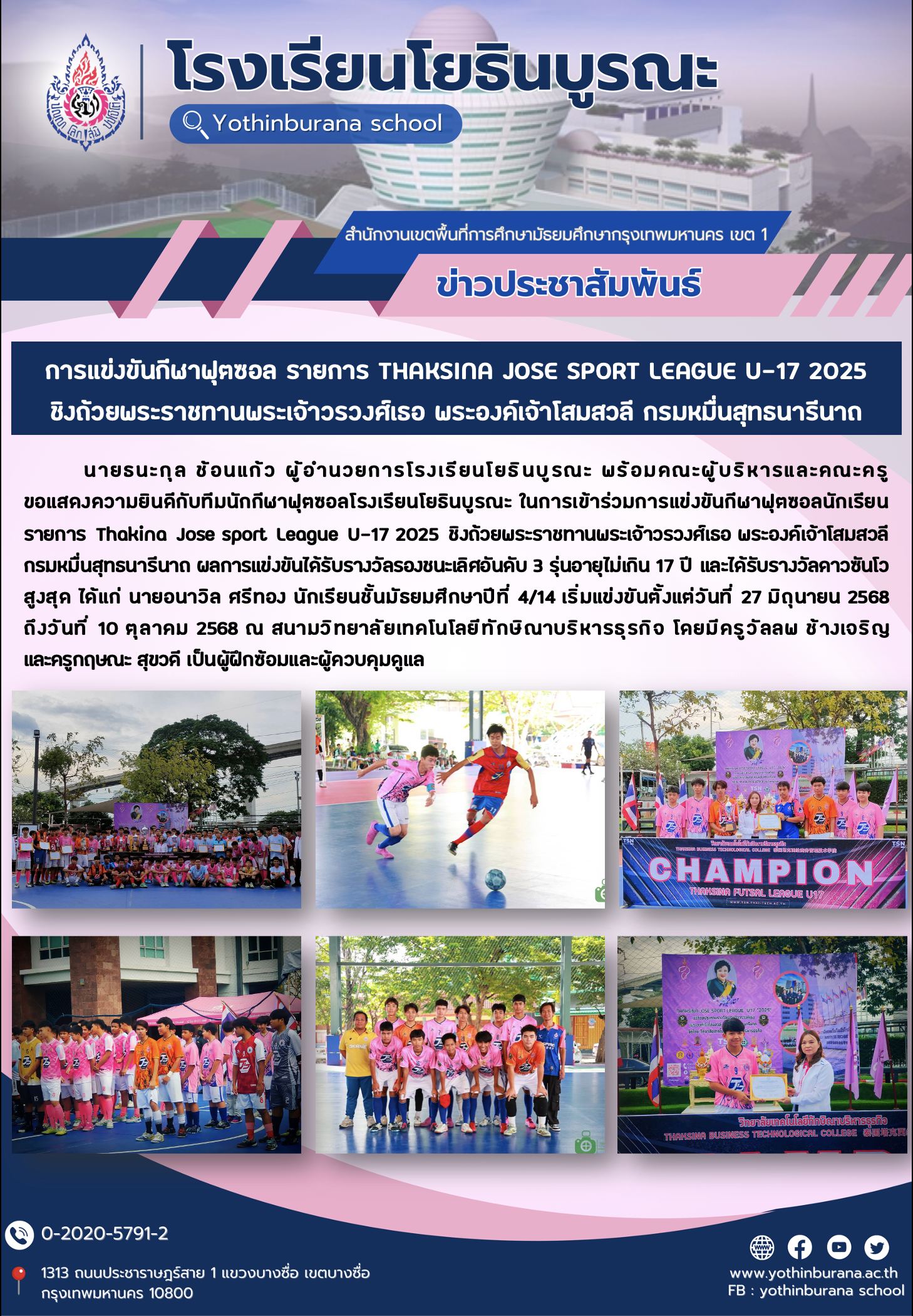นายธนะกุล ช้อนแก้ว ผู้อำนวยการโรงเรียนโยธินบูรณะ พร้อมคณะผู้บริหารและคณะครูขอแสดงความยินดีกับทีมนักกีฬาฟุตซอลโรงเรียนโยธินบูรณะ ในการเข้าร่วมการแข่งขันกีฬาฟุตซอลนักเรียนรายการ Thakina Jose sport League U-17 2025 ชิงถ้วยพระราชทานพระเจ้าวรวงศ์เธอ พระองค์เจ้าโสมสวลี กรมหมื่นสุทธนารีนาถ ผลการแข่งขันได้รับรางวัลรองชนะเลิศอันดับ 3 รุ่นอายุไม่เกิน 17 ปี และได้รับรางวัลดาวซันโวสูงสุด ได้แก่ นายอนาวิล ศรีทอง นักเรียนชั้นมัธยมศึกษาปีที่ 4/14 เริ่มแข่งขันตั้งแต่วันที่ 27 มิถุนายน 2568 ถึงวันที่ 10 ตุลาคม 2568 ณ สนามวิทยาลัยเทคโนโลยีทักษิณาบริหารธุรกิจ โดยมีครูวัลลพ ช้างเจริญ และครูกฤษณะ สุขวดี เป็นผู้ฝึกซ้อมและผู้ควบคุมดูแล