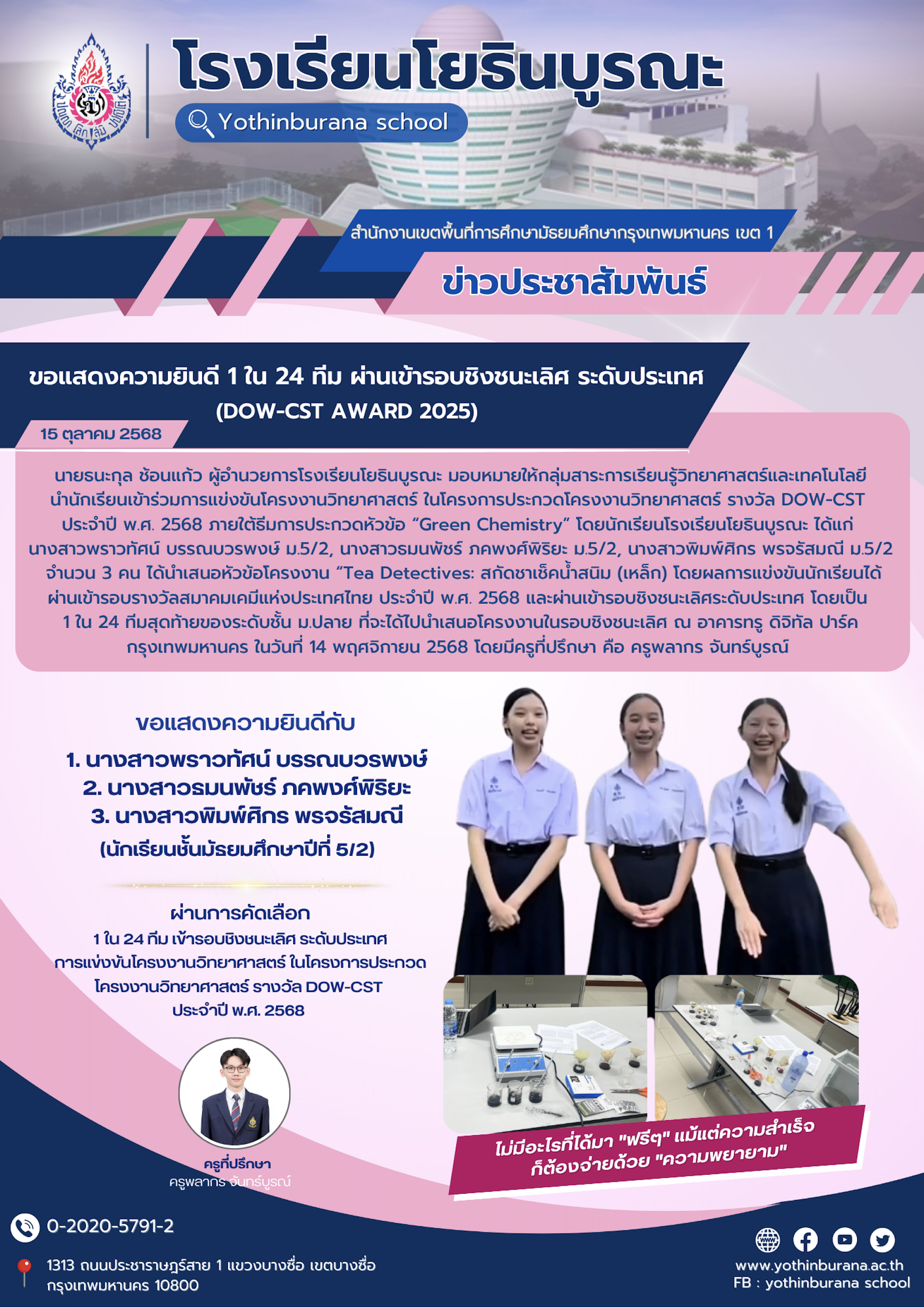 👉นายธนะกุล ช้อนแก้ว ผู้อำนวยการโรงเรียนโยธินบูรณะ มอบหมายให้กลุ่มสาระการเรียนรู้วิทยาศาสตร์และเทคโนโลยี นำนักเรียนเข้าร่วมการแข่งขันโครงงานวิทยาศาสตร์ ในโครงการประกวดโครงงานวิทยาศาสตร์ รางวัล DOW-CST ประจำปี พ.ศ. 2568 ภายใต้ธีมการประกวดหัวข้อ Green Chemistry โดยนักเรียนโรงเรียนโยธินบูรณะ ได้แก่ นางสาวพราวทัศน์ บรรณบวรพงษ์ ม.5/2, นางสาวธมนพัชร์ ภคพงศ์พิริยะ ม.5/2 และนางสาวพิมพ์ศิกร พรจรัสมณี ม.5/2 จำนวน 3 คน ได้นำเสนอหัวข้อโครงงาน Tea Detectives: สกัดชาเช็คน้ำสนิม (เหล็ก) โดยผลการแข่งขันนักเรียนได้ผ่านเข้ารอบรางวัลสมาคมเคมีแห่งประเทศไทย ประจำปี พ.ศ. 2568 และผ่านเข้ารอบชิงชนะเลิศระดับประเทศ โดยเป็น 1 ใน 24 ทีมสุดท้ายของระดับชั้น ม.ปลาย ที่จะได้ไปนำเสนอโครงงานในรอบชิงชนะเลิศ ณ อาคารทรู ดิจิทัล ปาร์ค กรุงเทพมหานคร ในวันที่ 14 พฤศจิกายน 2568 โดยมีครูที่ปรึกษา คือ ครูพลากร จันทร์บูรณ์