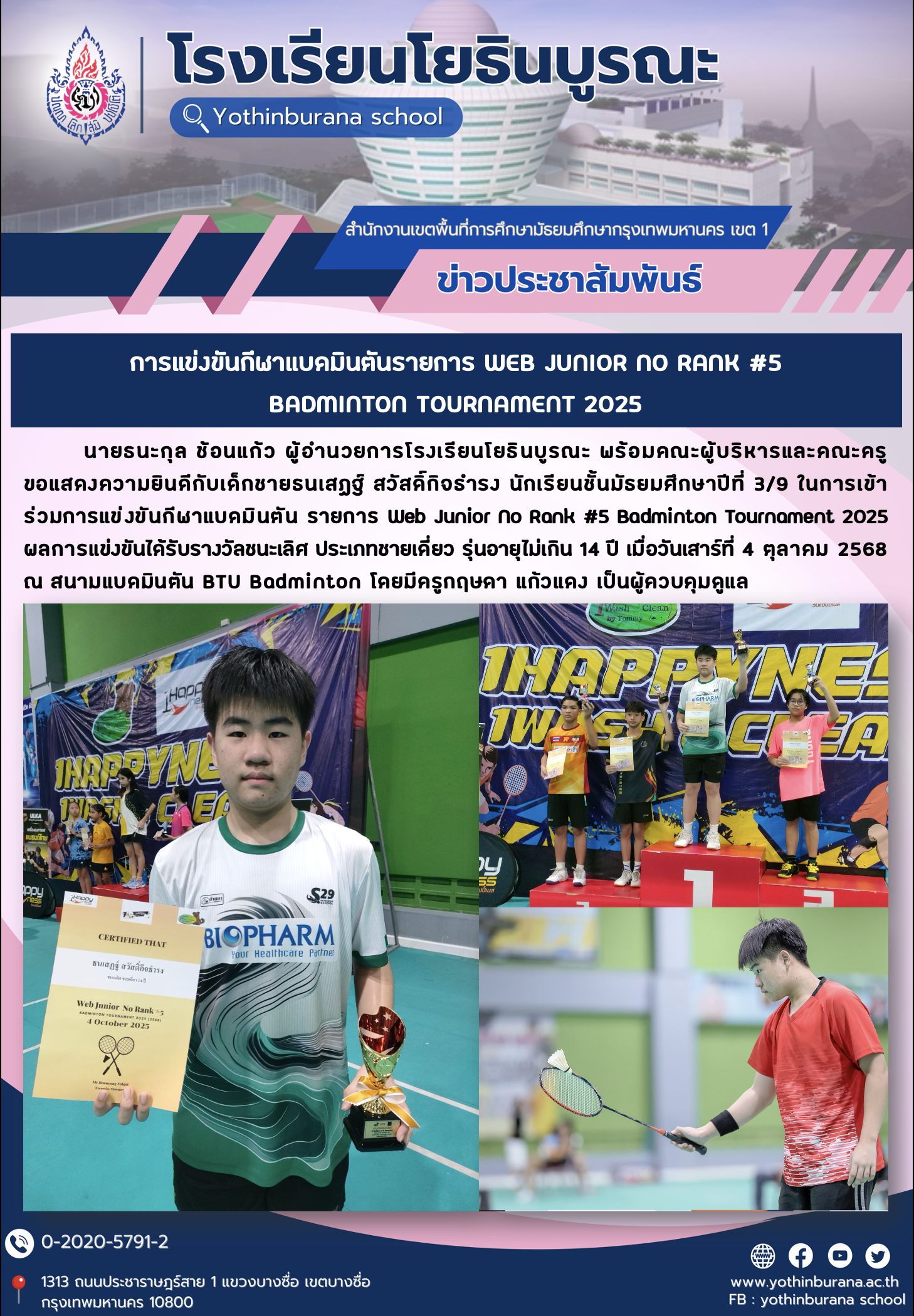 นายธนะกุล ช้อนแก้ว ผู้อำนวยการโรงเรียนโยธินบูรณะ พร้อมคณะผู้บริหารและคณะครู ขอแสดงความยินดีกับเด็กชายธนเสฏฐ์ สวัสดิ์กิจธำรง นักเรียนชั้นมัธยมศึกษาปีที่ 3/9 ในการเข้าร่วมการแข่งขันกีฬาแบดมินตัน รายการ Web Junior No Rank #5 Badminton Tournament 2025 ผลการแข่งขันได้รับรางวัลชนะเลิศ ประเภทชายเดี่ยว รุ่นอายุไม่เกิน 14 ปี เมื่อวันเสาร์ที่ 4 ตุลาคม 2568 ณ สนามแบดมินตัน BTU Badminton โดยมีครูกฤษดา แก้วแดง เป็นผู้ควบคุมดูแล