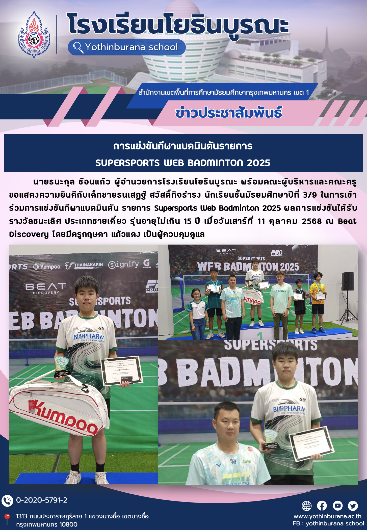 นายธนะกุล ช้อนแก้ว ผู้อำนวยการโรงเรียนโยธินบูรณะ พร้อมคณะผู้บริหารและคณะครู ขอแสดงความยินดีกับเด็กชายธนเสฏฐ์ สวัสดิ์กิจธำรง นักเรียนชั้นมัธยมศึกษาปีที่ 3/9 ในการเข้าร่วมการแข่งขันกีฬาแบดมินตัน รายการ Supersports Web Badminton 2025 ผลการแข่งขันได้รับรางวัลชนะเลิศ ประเภทชายเดี่ยว รุ่นอายุไม่เกิน 15 ปี เมื่อวันเสาร์ที่ 11 ตุลาคม 2568 ณ Beat Discovery โดยมีครูกฤษดา แก้วแดง เป็นผู้ควบคุมดูแล