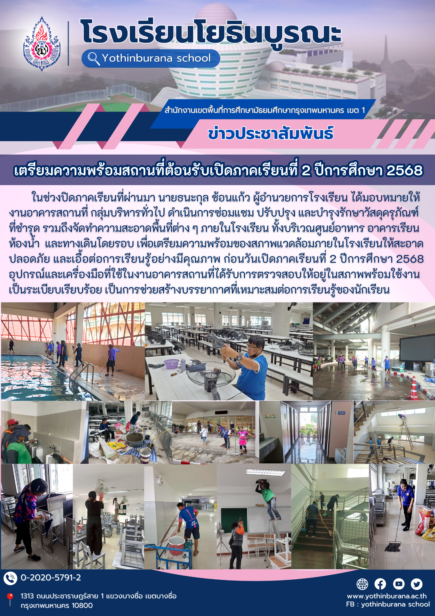 ในช่วงปิดภาคเรียนที่ผ่านมา นายธนะกุล ช้อนแก้ว ผู้อำนวยการโรงเรียน ได้มอบหมายให้งานอาคารสถานที่ กลุ่มบริหารทั่วไป ดำเนินการซ่อมแซม ปรับปรุง และบำรุงรักษาวัสดุครุภัณฑ์ที่ชำรุด รวมถึงจัดทำความสะอาดพื้นที่ต่าง ๆ ภายในโรงเรียน ทั้งบริเวณศูนย์อาหาร อาคารเรียน ห้องน้ำ และทางเดินโดยรอบ เพื่อเตรียมความพร้อมของสภาพแวดล้อมภายในโรงเรียนให้สะอาด ปลอดภัย และเอื้อต่อการเรียนรู้อย่างมีคุณภาพ ก่อนวันเปิดภาคเรียนที่ 2 ปีการศึกษา 2568 อุปกรณ์และเครื่องมือที่ใช้ในงานอาคารสถานที่ได้รับการตรวจสอบให้อยู่ในสภาพพร้อมใช้งาน เป็นระเบียบเรียบร้อย เป็นการช่วยสร้างบรรยากาศที่เหมาะสมต่อการเรียนรู้ของนักเรียน