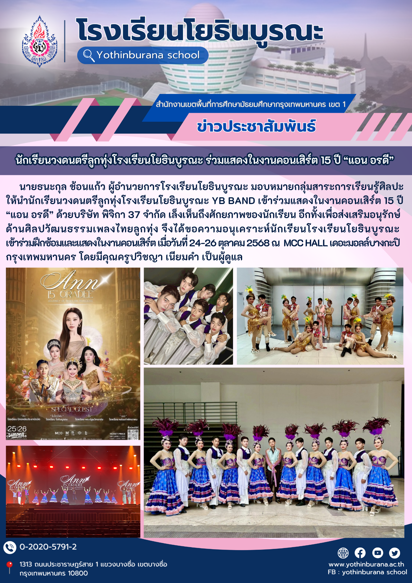 นายธนะกุล ช้อนแก้ว ผู้อำนวยการโรงเรียนโยธินบูรณะ มอบหมายกลุ่มสาระการเรียนรู้ศิลปะ ให้นำนักเรียนวงดนตรีลูกทุ่งโรงเรียนโยธินบูรณะ YB Band เข้าร่วมแสดงในงานคอนเสิร์ต 15 ปี แอน อรดี ด้วยบริษัท พิจิกา 37 จำกัด เล็งเห็นถึงศักยภาพของนักเรียน อีกทั้งเพื่อส่งเสริมอนุรักษ์ ด้านศิลปวัฒนธรรมเพลงไทยลูกทุ่ง จึงได้ขอความอนุเคราะห์นักเรียนโรงเรียนโยธินบูรณะ เข้าร่วมฝึกซ้อมและแสดงในงานคอนเสิร์ต เมื่อวันที่ 24-26 ตุลาคม 2568 ณ MCC Hall เดอะมอลล์บางกะปิ กรุงเทพมหานคร โดยมีคุณครูปวิชญา เนียมคำ เป็นผู้ดูแล