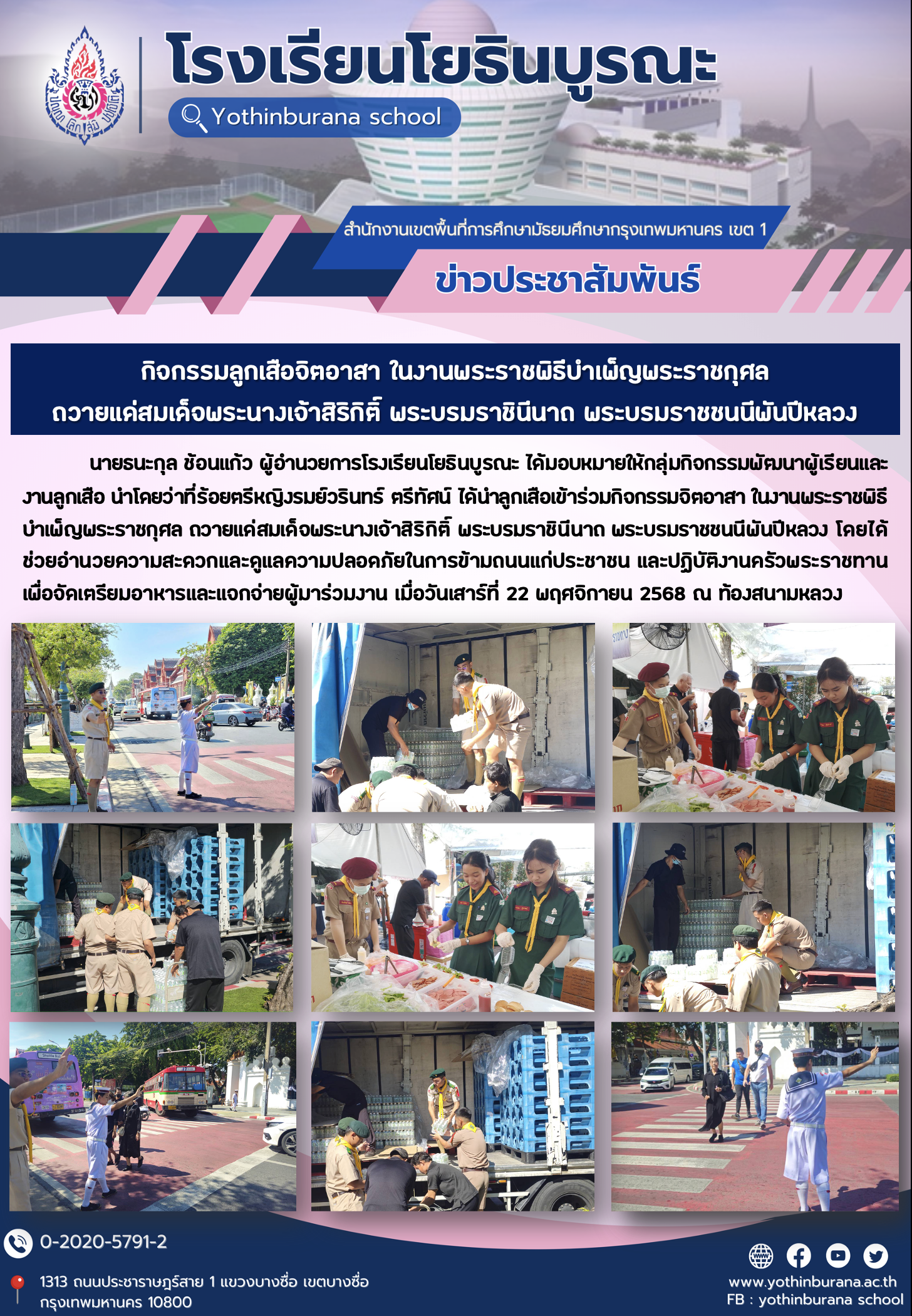 นายธนะกุล ช้อนแก้ว ผู้อำนวยการโรงเรียนโยธินบูรณะ ได้มอบหมายให้กลุ่มกิจกรรมพัฒนาผู้เรียนและงานลูกเสือ นำโดยว่าที่ร้อยตรีหญิงรมย์วรินทร์ ตรีทัศน์ ได้นำลูกเสือเข้าร่วมกิจกรรมจิตอาสา ในงานพระราชพิธีบำเพ็ญพระราชกุศล ถวายแด่สมเด็จพระนางเจ้าสิริกิติ์ พระบรมราชินีนาถ พระบรมราชชนนีพันปีหลวง โดยได้ช่วยอำนวยความสะดวกและดูแลความปลอดภัยในการข้ามถนนแก่ประชาชน และปฏิบัติงานครัวพระราชทาน เพื่อจัดเตรียมอาหารและแจกจ่ายผู้มาร่วมงาน เมื่อวันเสาร์ที่ 22 พฤศจิกายน 2568 ณ ท้องสนามหลวง